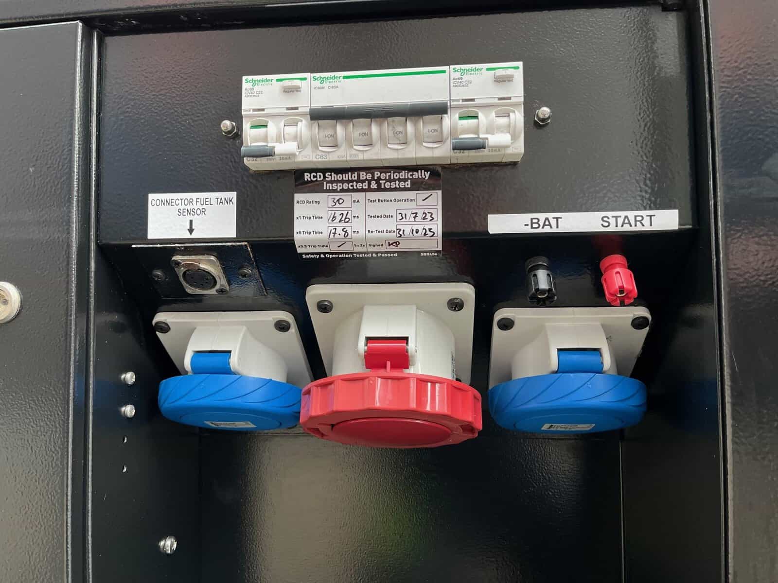 The RCD unit and engine oil drain pump add to the convenience of this model, streamlining maintenance and safety checks, which is particularly beneficial in rental scenarios where equipment needs to be reliable and easy to manage. Additionally, the central lifting eye and fork pockets make transportation and on-site deployment straightforward, ensuring this generator can be easily relocated as needed.